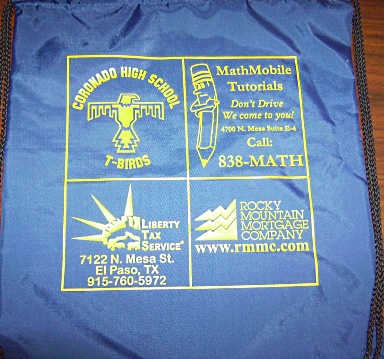 | Sporty Back Pack 100% Cotton with Drawstring Product Size 14"w X 18"h Ad Size: 8"w x 10"h A fun simple backpack to stuff and go while showing your school pride. Our most popular bag is great for any school event or taking on that field trip to the theme parks, museums or carrying books to school and more. Made of 190t nylon. Available in: Black, Bright Orange, Carolina Blue, Dark Green, Dark Orange, Navy, Pink, Red, Royal and White |